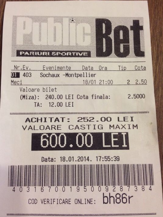 Meciul a fost jucat la agentia Publicbet, suma mizata a fost 252.00 LEI, iar biletul castigator ne-a adus suma de 600 LEI, in cont.