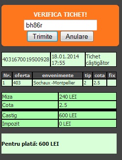 19.01.2014 BILET SPECIAL *4* – REZULTAT FINAL ( Agentie: Publicbet, Cota bilet: 2.50, Miza: 252 LEI, Castig: 600 )
